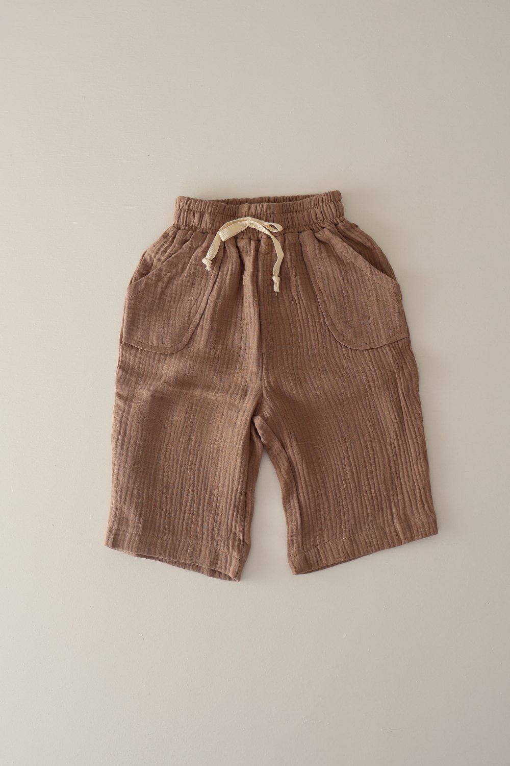 Made from breathable cotton muslin gauze, they feature a relaxed fit with playful oversized front pockets, a comfy elastic waistband, and an adjustable drawstring to ensure a flexible, long-lasting fit as your little one grows.