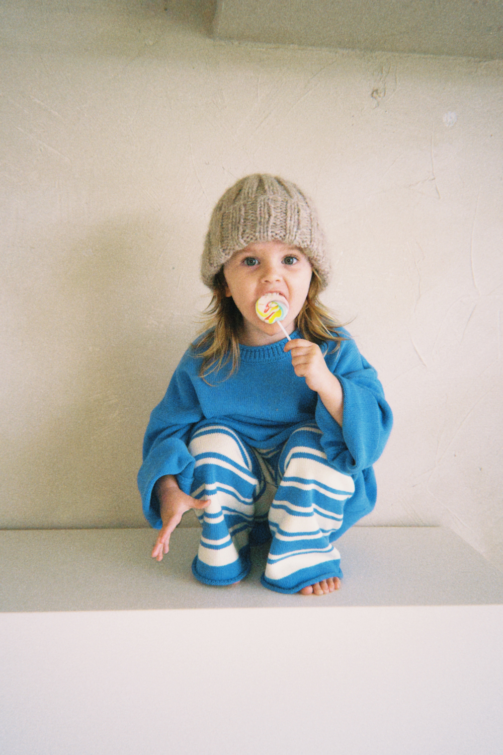 Striped in blueberry hues, the Rolly Stripe Knit Pants are an effortless pull-on style your mini will live in. Knitted from the dreamiest pure cotton in a playful retro stripe and finished with our signature rolled hems, they offer a relaxed, lived-in feel — perfect for busy kids!